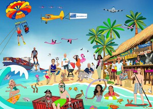 2020Happy island Aruba, een samensmelting van prachtige elementen van het mooie Caribische eiland, zoals Choco de uil, de carnaval, trupiaal de vuurtoren het strand en de leguaan, dit schilderij is het ontwerp voor een herbruikbare tas voor de supermarkt Ling and Sons Happy island Aruba, all the best parts of Aruba in one painting, The carnaval, choco the owl, iguana and of course the lighthouse.